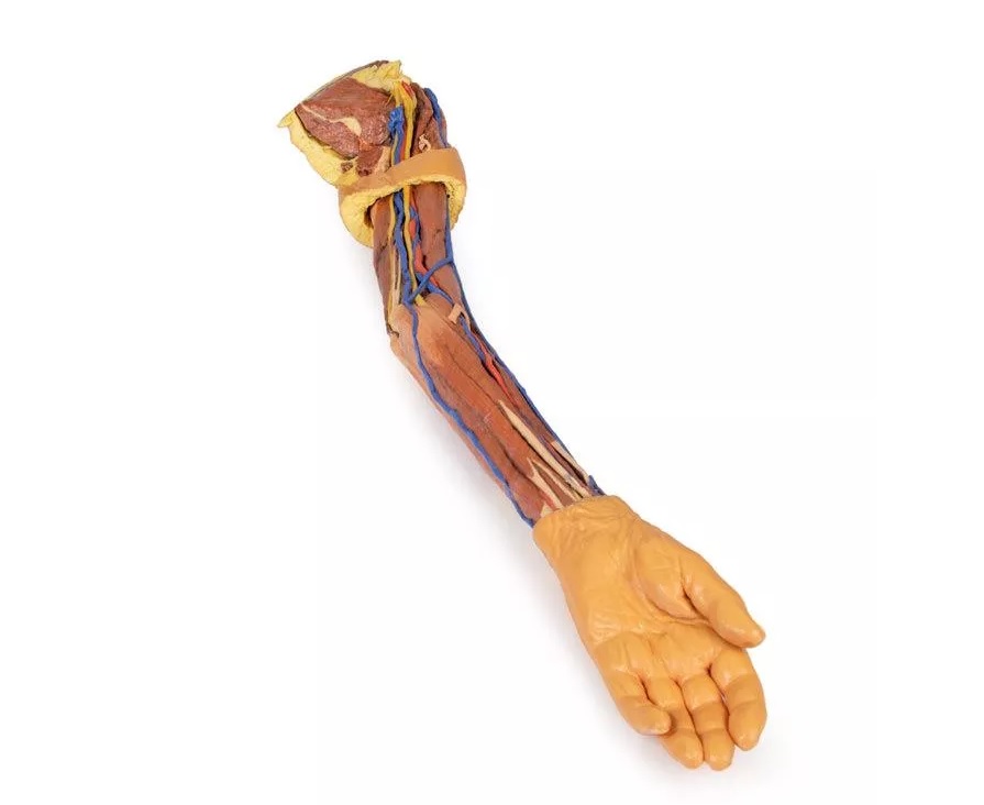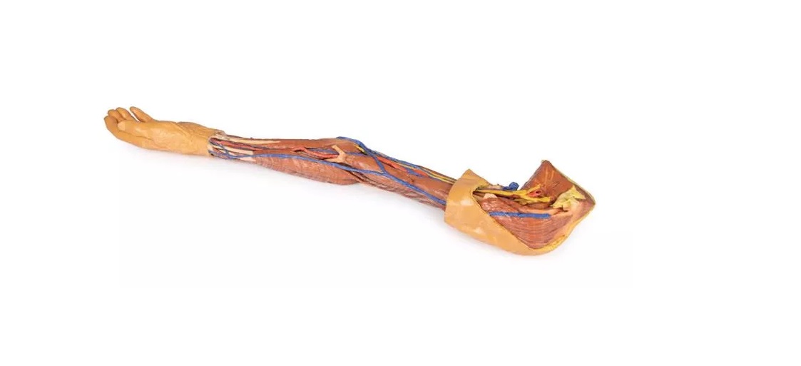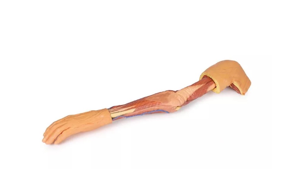Tento 3D tištěný model zobrazuje detailní anatomický pohled na levou horní končetinu, sahající od lopatky po konečky prstů. Většina kůže a fascie byla odstraněna, aby se odhalily svaly, cévy a nervy a kosti, zatímco vybrané oblasti (jako je hřbet lopatky, proximální část paže a ruka) si zachovávají povrchové krytí. Model znázorňuje ramenní pletenec, humerus, ulnu, radius, zápěstí, karpální i metakarpální kosti.