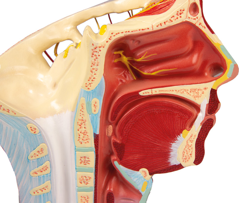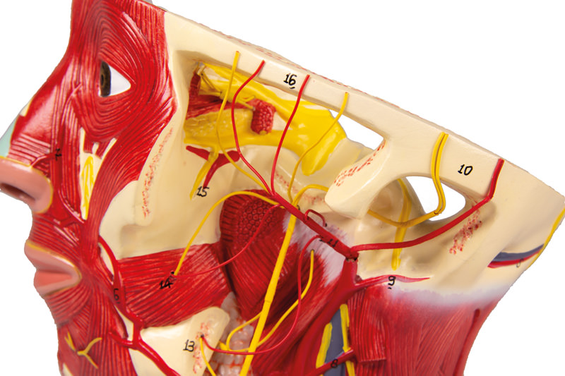 Model poloviny lidské hlavy znázorňuje průběh levé zevní karotické tepny včetně kolaterálních a koncových větví v oblasti hlavy a krku.