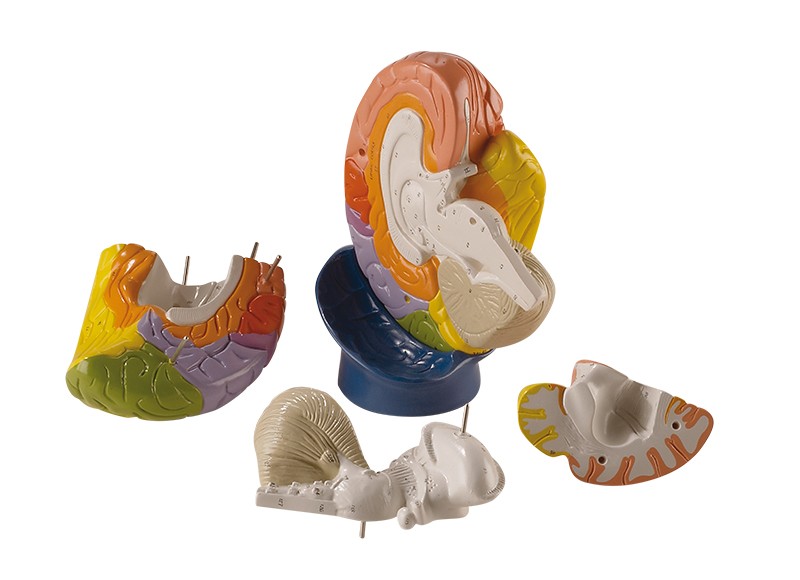 frontální lalok, parietální lalok, týlní lalok, temporální lalok, motorická kůra, somatosenzorická kůra, limbický systém (llimbická kůra), mozeček, mozkový kmen. Dvanáct lebečních nervů a další funkce jsou očíslovány. Dodáváno se stojanem.