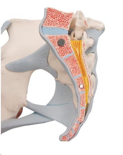 Model ženské pánve v životní velikosti detailně představuje topografii kostí, vazů, cév, svalů pánevního dna a ženských pánevních orgánů, vyjímatelný vnější anální svěrač, vnější uretrální svěrač, hluboké a povrchové příčné perineální svalstvo a sval bulbospongiosus, dále vyjímatelný a dělený konečník, děloha s vejcovody, vaječníky a vagína, pravá polovina pánve demonstruje topografii společné ilické tepny, vnější a vnitřní tepny, ale i společné ilické žíly a vnější ilické žíly, znázornění pravého sakrálního plexu, pravého sedacího nervu a pravého stydkého nervu, model dále obsahuje: dvě kyčelní kosti, stydkou kost, křížovou kost s kostrčí a 5. bederní obratel s meziobratlovou ploténkou, řez pátým bederním obratlem, kostrč a kost křížová mohou být rozebrány pro odhalení části cauda equina v páteřním kanálu, odnímatelný pátý bederní obratel, pravá polovina modelu ilustruje tyto pánevní vazy: tříslový, sakrotuberální, sakrospinózní, přední sakroilický, iliolumbální, přední podélný, mezikostní sakroilický, zadní sakroilický a membrána obturátoru.