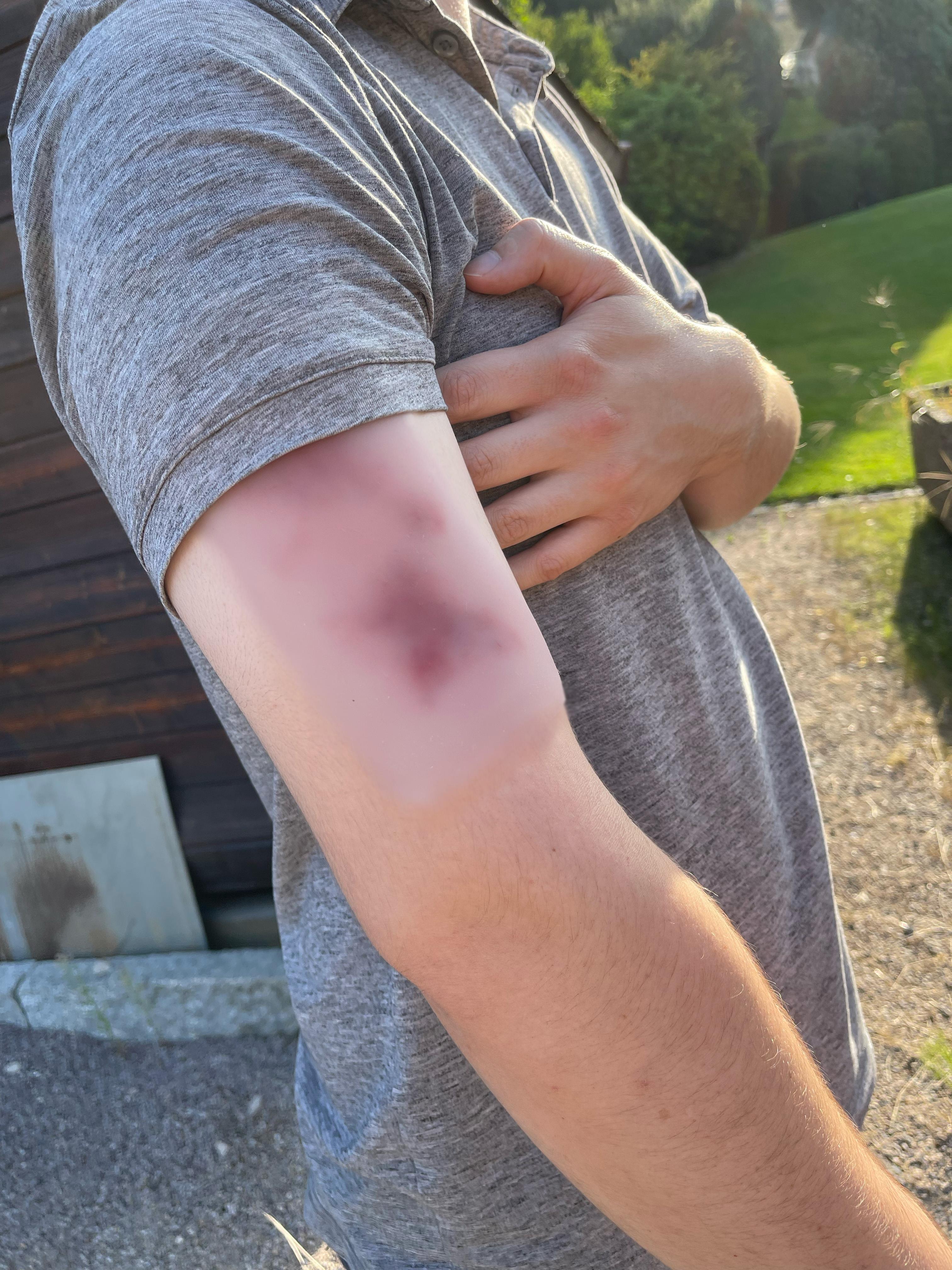 Tato silikonová imitace poranění znázorňuje čerstvý hematom. Poranění se samostatně přichytí nai pacienta nebo figurínu, ale lze ho také připevnit speciálním kožním lepidlem pro dlouhodobější cvičení.