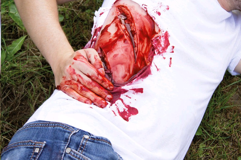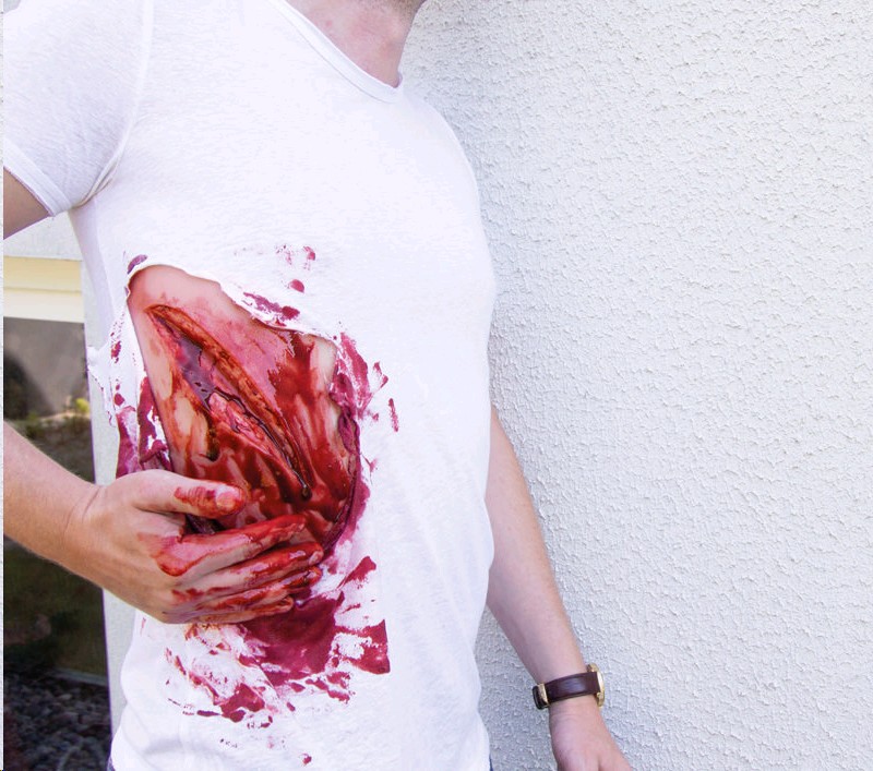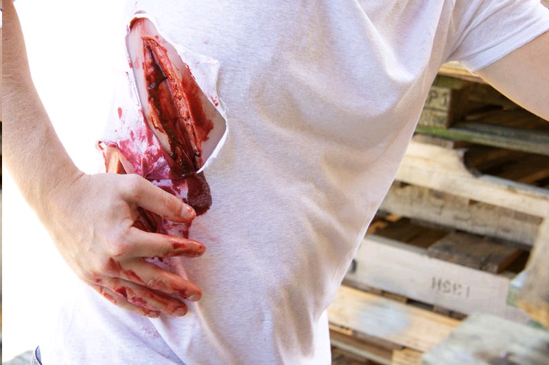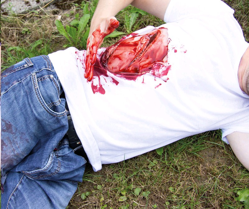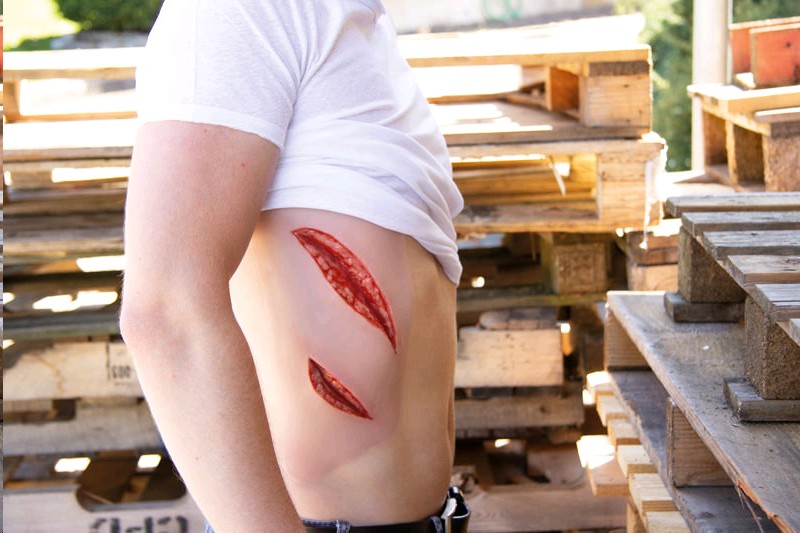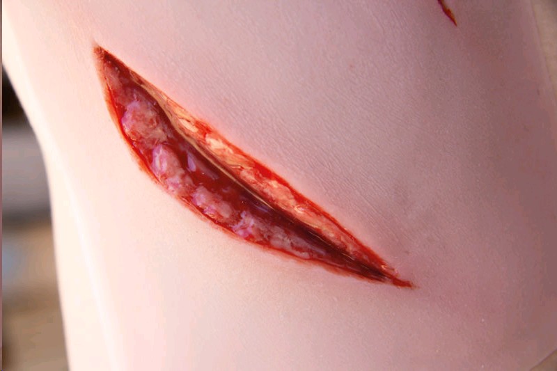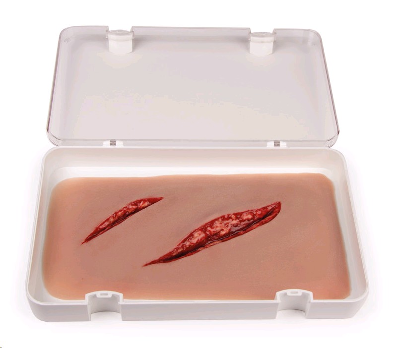 Imitace rozsáhlého hlubokého řezu včetně hadičky pro použití umělé krve ke krvácení. Imitace přilne k pokožce nebo figuríně. Pro delší používání lze dokoupit speciální lepidlo. Dodává se v úložném pouzdře.