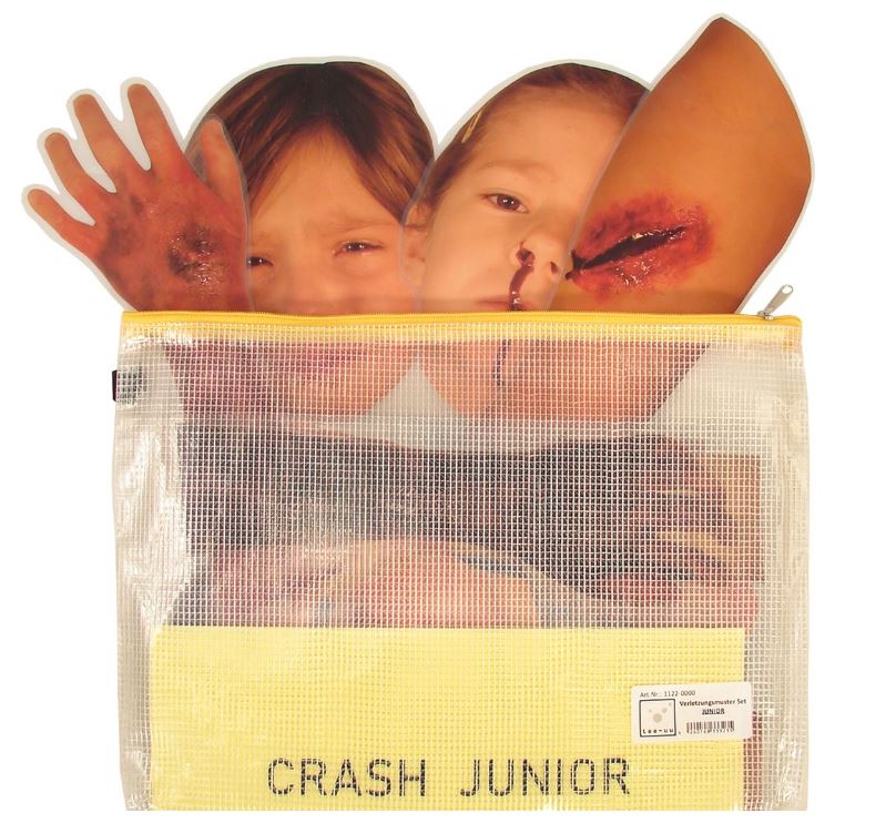 Sada imitací poranění je určená k záchranářské figuríně CRASH JUNIOR. Sada obsahuje 24 laminovaných dílů s různými realisticky vyobrazenými zraněními, které jsou navrženy s ohledem na zranění a nouzové situace typické pro scénáře, v nichž figurují děti.
