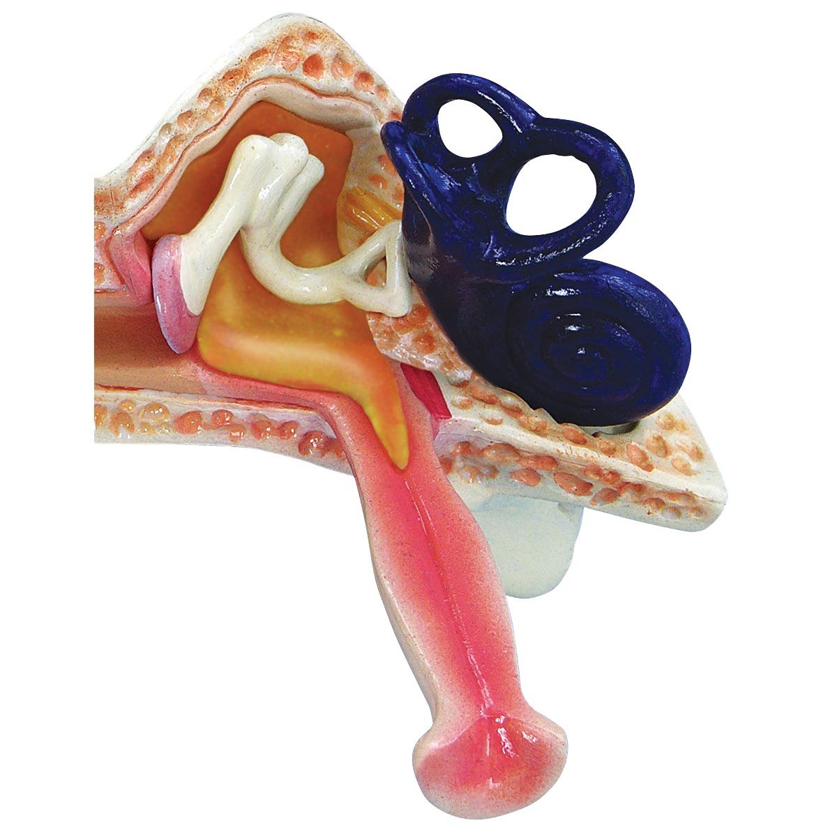 Popis Tento nadměrně velký model dětského ucha znázorňuje: polokruhové kanálky a hlemýžď ??vnitřního ucha; sluchové kůstky, zánět středního ucha (zánět a simulovaná tekutina ve středním uchu); tympanická membrána, temporální a tenzorické bubínkové svaly; model také představuje horizontální Eustachovu trubici typickou pro dítě.