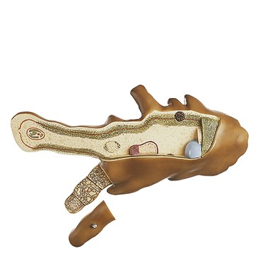Měňavka (Amoeba), zvětšeno cca. 1000 krát vyrobeno ze speciálního materiálu SOMSO-Plast®. Rozděleno na 2 části. Na zelené základně.
