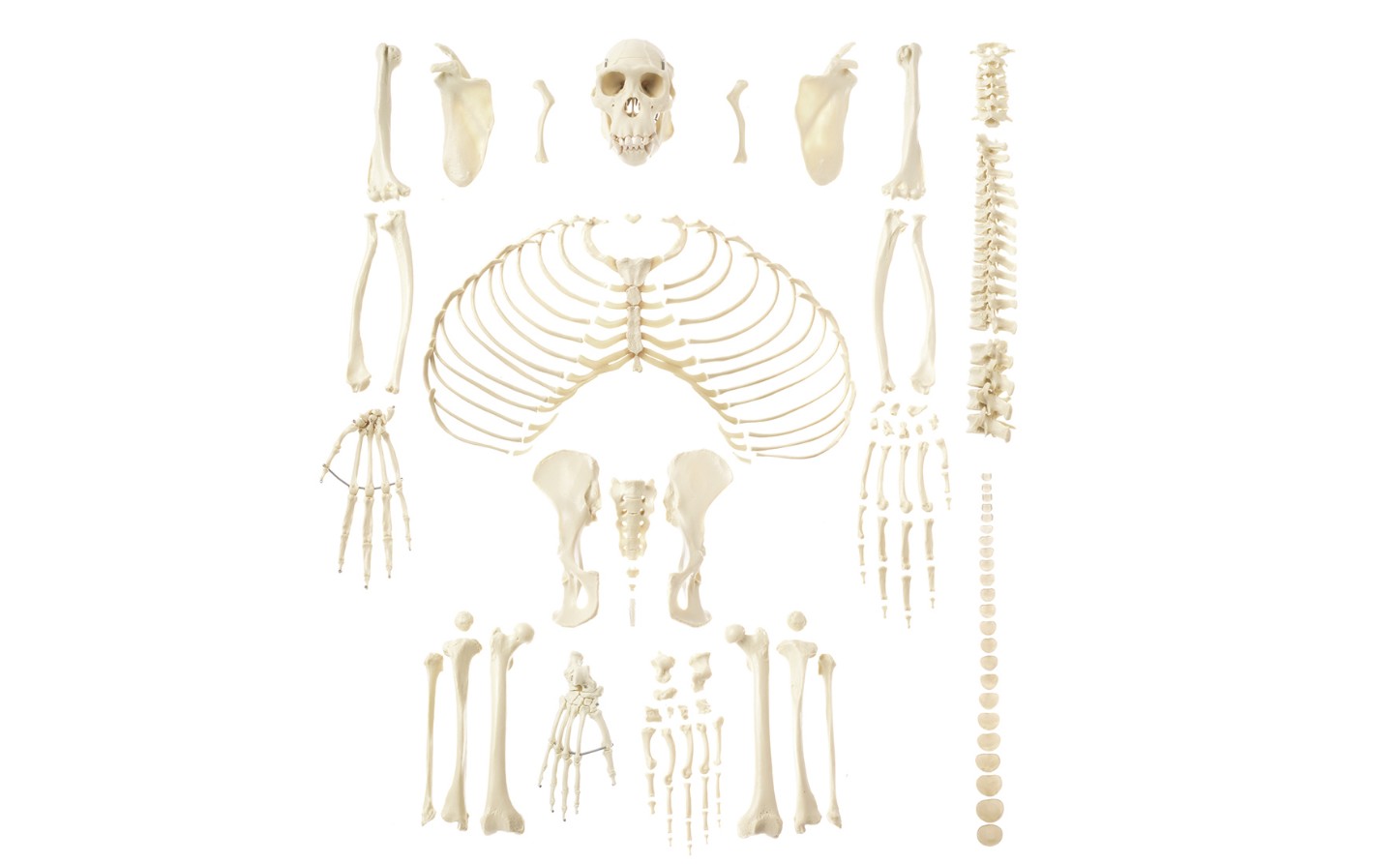 Odlitky z přírodních vzorků vyrobeno ze speciálního materiálu SOMSO-Plast®. S výjimkou lebky (se snímatelnou klenbou a dolní čelistí), jednou rukou a jednou nohou jsou všechny kosti odmontovány. Dodává se v plastových sáčcích v lepenkové krabici.