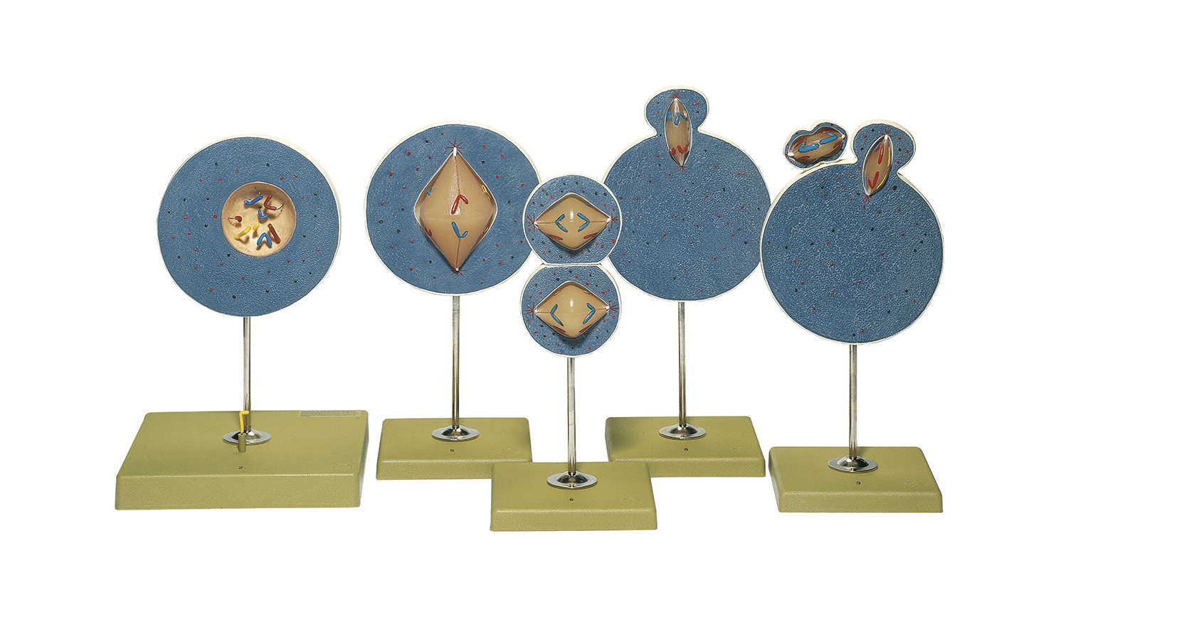 Mnohokrát zvětšeno vyrobeno ze speciálního materiálu SOMSO-Plast®. Chromozomy otcovského a mateřského původu, stejně jako hetero chromozómy zobrazené v různých barvách. Skládá se z 5 jednotlivých modelů. Jednotlivě na stojanu se zeleným podstavcem